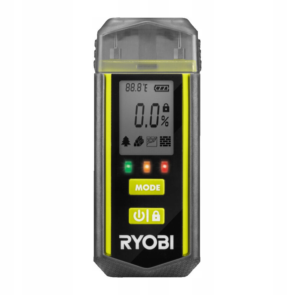вимірювач вологості RBPINMM1 RYOBI пропонує чотири режими визначення вологості в хвойних, листяних породах, гіпсокартоні та аерованому бетоні. Діапазон вимірювання від 0% до 99,9% дозволяє легко ідентифікувати потенційну шкідливу вологу у вашому будинку, Каравані і при будь-яких роботах по деревообробці. Захисна кришка включає в себе функцію самоперевірки, а зручна функція утримання зчитує процентний вміст вологи у важкодоступних місцях. Удосконалені електронні чіпи відображають відсоткове зчитування вологості в реальному часі на екрані, а інтуїтивно зрозумілі світлодіоди загоряються в залежності від процентного рівня вологості кожного матеріалу. Легка в інтерпретації Світлодіодна Сигналізація: зелений означає Сухий, жовтий-середній вологий, а червоний-вологий. В комплекті 2 батарейки ААА.