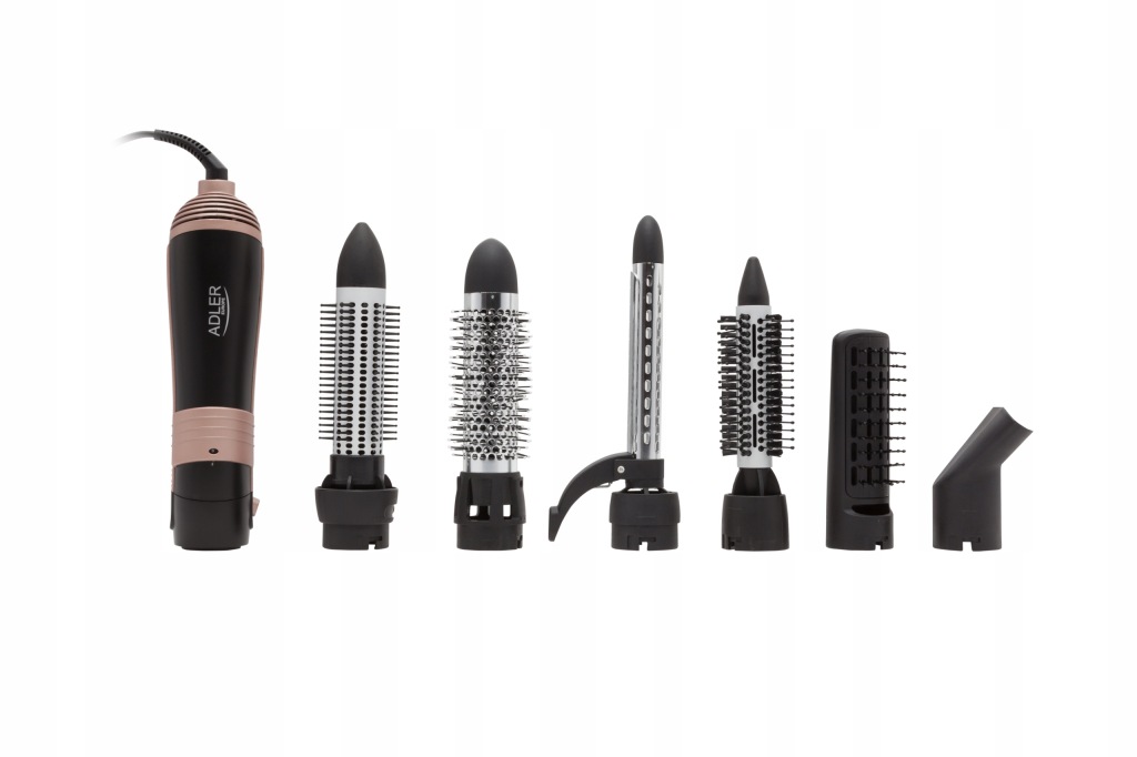 - 6 змінних насадок, в тому числі: 3 щітки діаметром: 34 мм, 33 мм і 22 мм щипці для завивки діаметром 20 мм гребінь і конденсатор