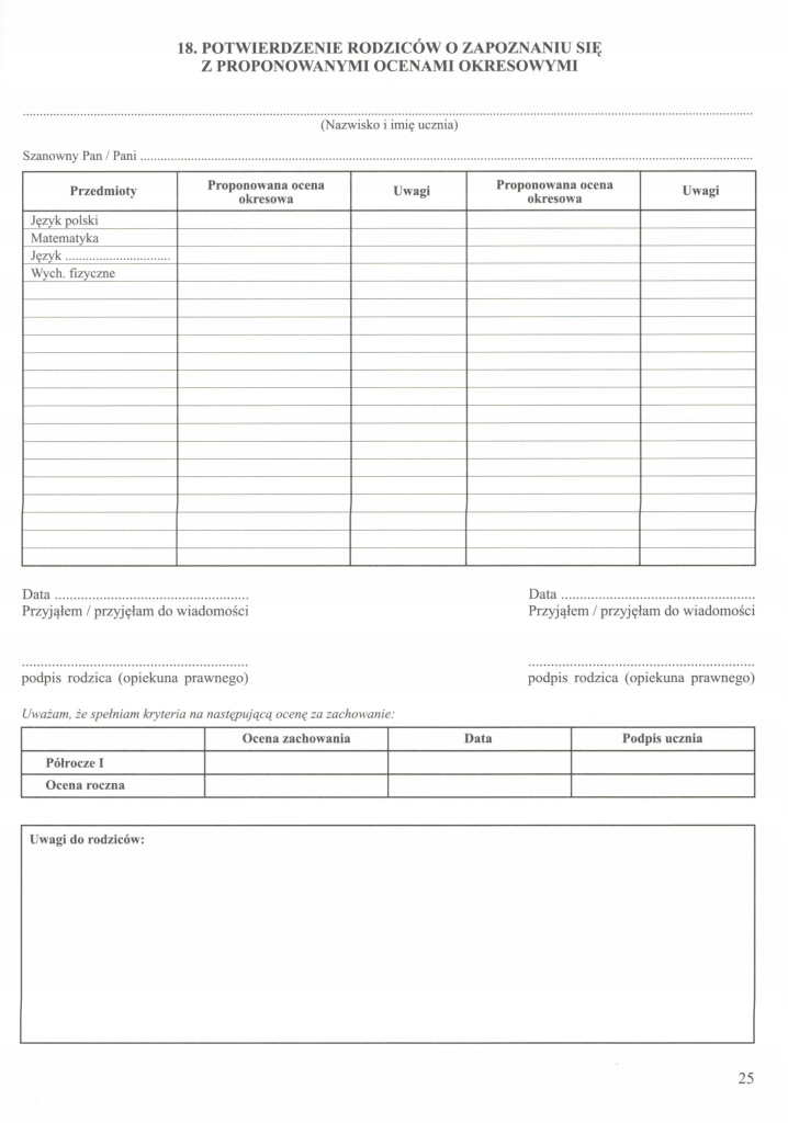 18. Підтвердження батьків про ознайомлення з пропонованими періодичними оцінками / зауваження вчителів / самооцінка поведінки учня