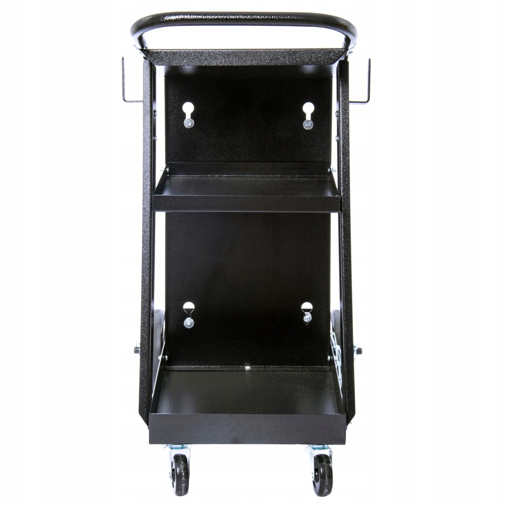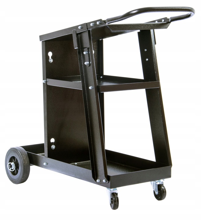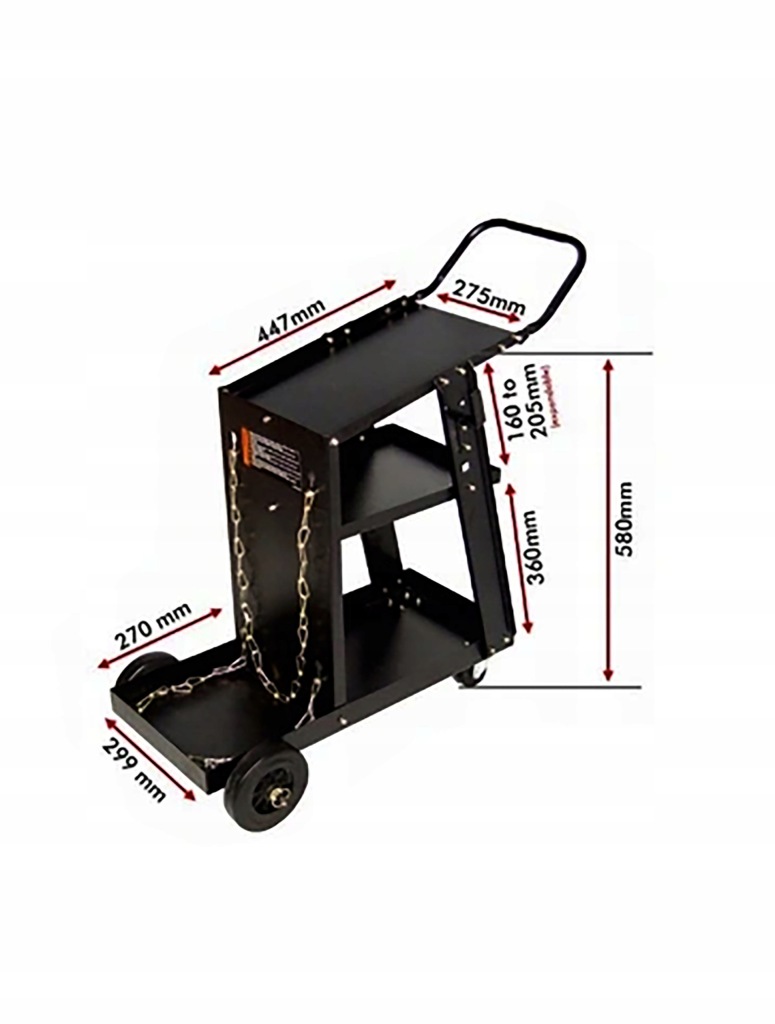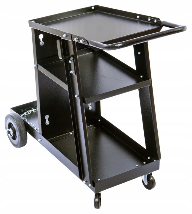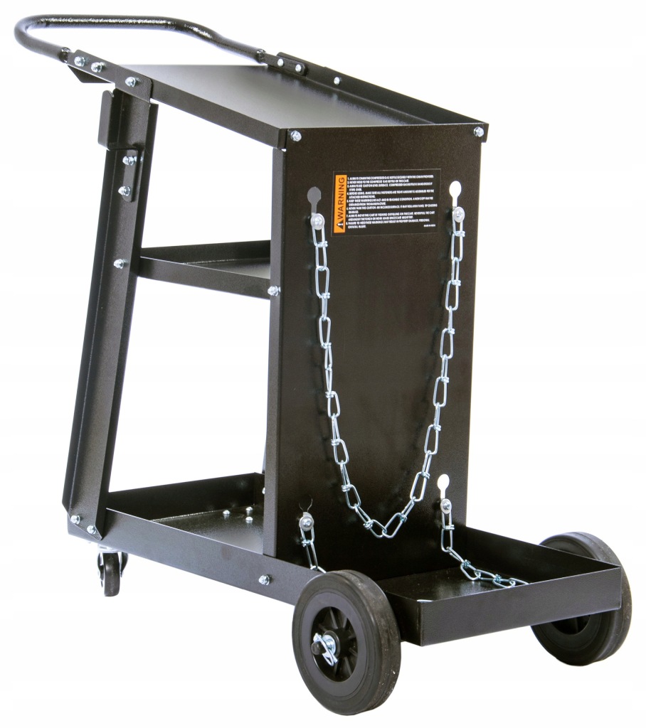 пропонована транспортний візок оснащена 3 місткими полицями і місцем для установки захисного газового балона. Міцна металева конструкція, виготовлена з високоякісної товстої сталі, витримує навантаження до 90 кг. Кутова верхня полиця, на якій можна розмістити зварювальний апарат, забезпечить кращий контроль, а дві інші нададуть місце для необхідного обладнання та аксесуарів. Зручна транспортна ручка полегшує переміщення візка.