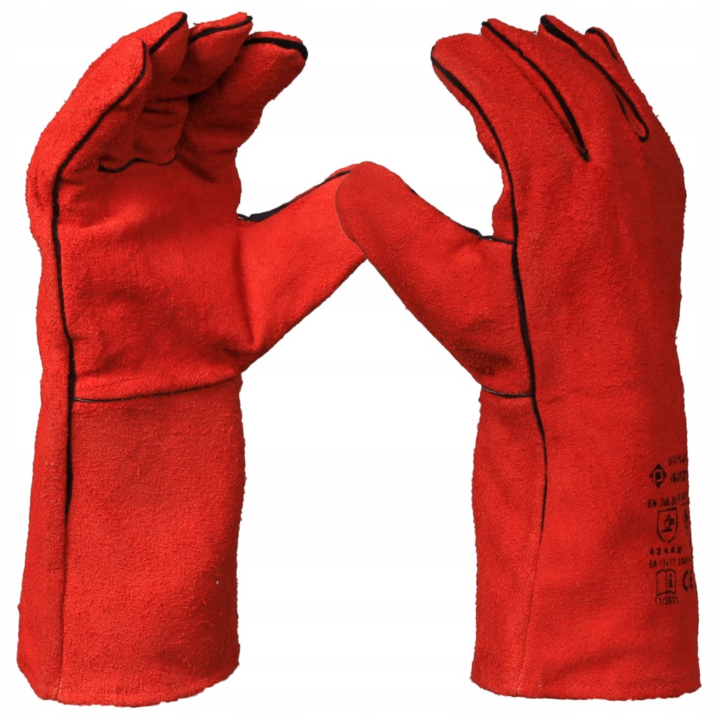 зварювальні рукавички , дуже хорошої якості, виготовлені з коровʼячої шкіри з чорною окантовкою уздовж шити.
