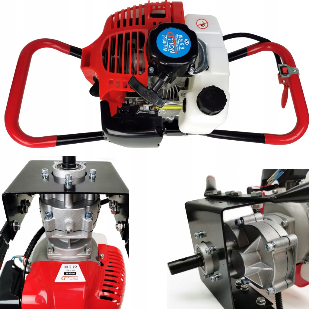 компактна бурова установка з двигуном внутрішнього згоряння, відома і шанована маркаNOLLD . Бурова установка з міцною і міцною конструкцією, виготовлена з високоякісних матеріалів. Бурова установка оснащена двотактним двигуном потужністю 6,5 к.с.. Вихлопної шнек, призначений для робіт, повʼязаних з садівництвом і озелененням, незамінний під час будь-яких земляних робіт, для підготовки земель під лісовідновлення, посівів, для свердління отворів під парканні стовпи і багатьох інших земляних робіт. Оптимально підібрані обороти трансмісії дозволяють працювати без особливого навантаження на оператора. Безпека під час роботи гарантується відцентровою муфтою.