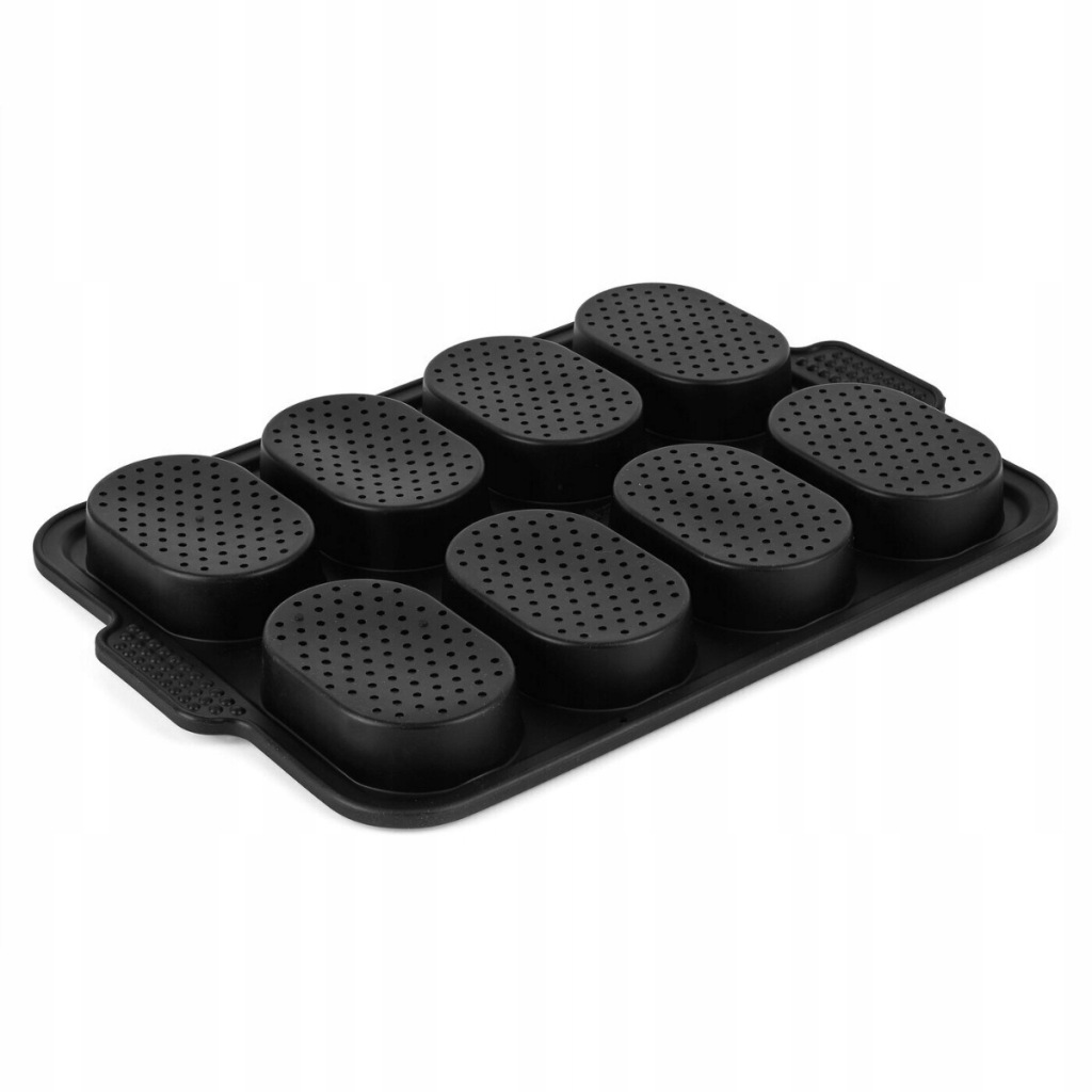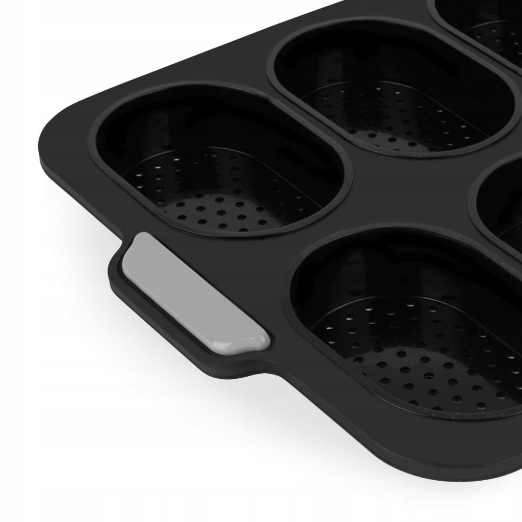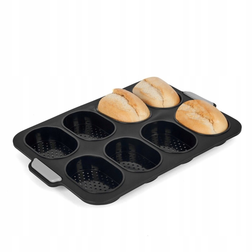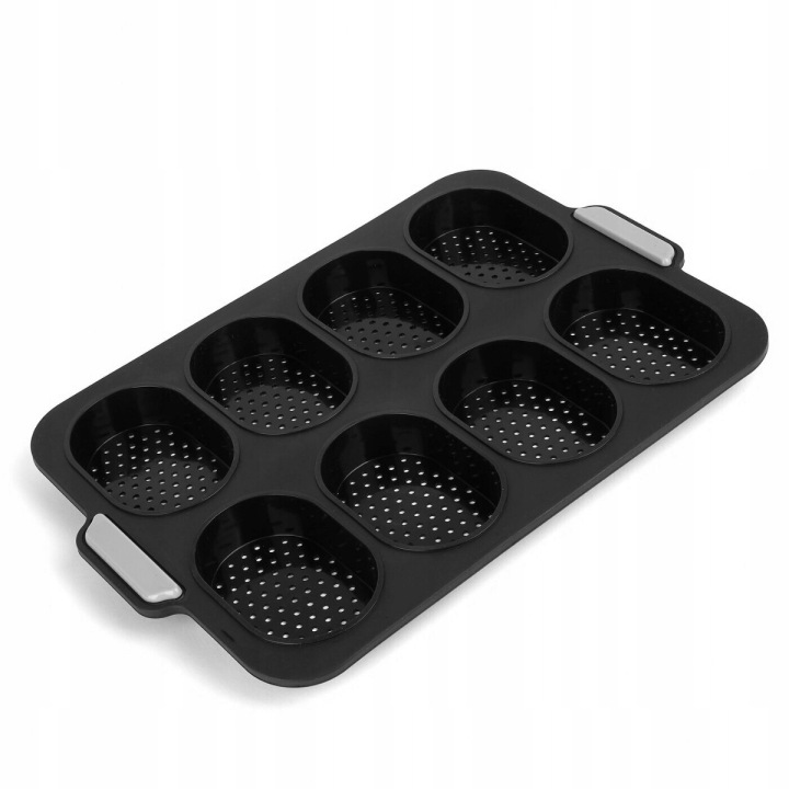 форма для випічки 8 булочок Silico 34,5 x 23,8 x 2,5 см чорний допоможе приготувати ідеально рівні булочки однакової форми. завдяки перфорації вони будуть оптимально випікатися і хрустіти. ручки для зняття форми гарантують безпеку. Виготовлення з силікону означає довговічність і стійкість.