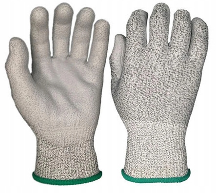 рукавички для захисту від порізів трикотажні безшовні сірого кольору, виготовлені зі спеціального трикотажу з захистом від порізів (PE-UHMW), нитки білого і чорного кольору, покриті в захватной частини сірим поліуретаном , завершені ребристою різьбою.
