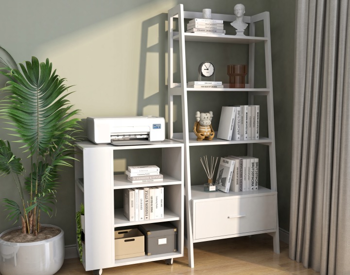 багатофункціональний візок білого кольору пропонує відкритий простір для зберігання для акуратного домашнього офісу.