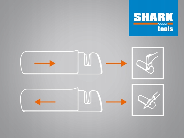 завдяки простому і інтуїтивно зрозумілому механізму точилка Shark Tools проста у використанні навіть для початківців. Досить протягнути лезо через проріз з правильно нахиленими керамічними дисками кілька разів, щоб отримати ідеально заточений край. Завдяки простому механізму заточка займає всього кілька хвилин, що економить час і енергію. Вбудовані протиковзкі елементи забезпечують стабільність пристрою під час роботи.