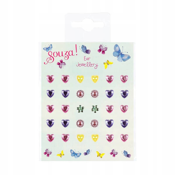 набір самоклеючих сережок метелики голландської фірми Souza. Набір складається з 30 штук (15 пар) маленьких сережок у формі серця (Фуксія, темно-фіолетовий і жовтий), кіл (темно-рожевий) і квітів (темно-зелений). Сережки нетоксичні і не подразнюють шкіру. Самоклеючі прикраси-це неінвазивний і безпечний вибір для дітей замість традиційних прикрас. Крім того, завдяки багатьом елементам, цього вистачить на довгий час. Ідеально підходить для подарунка або в якості доповнення до нього.