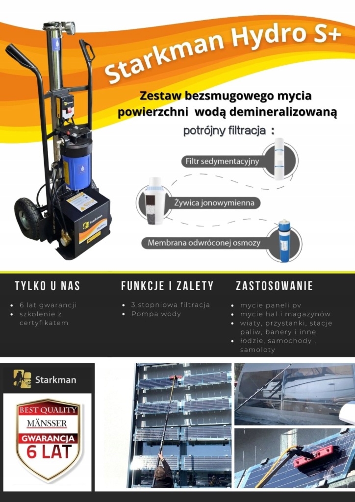 Starkman Hydro SStarkman Hydro s - це система серії "Semi-Professional"для безмасляної мийки на основі демінералізованої води зі спеціальними телескопічними палицями висотою до 20 метрів від положення Землі. пристрій, призначений для миття малих і середніх поверхонь . Він має вбудований водяний насос, здатний витягувати воду з резервуара.