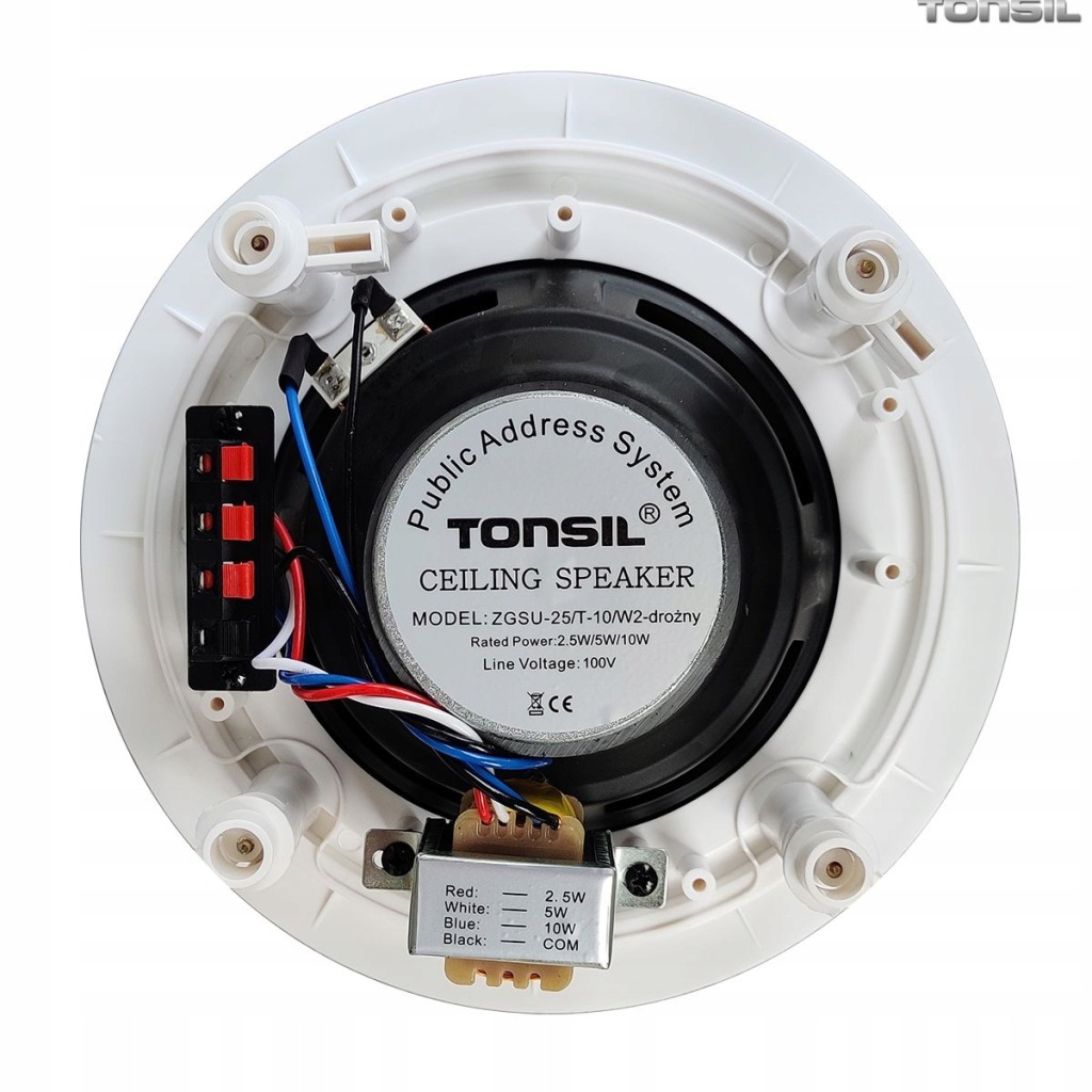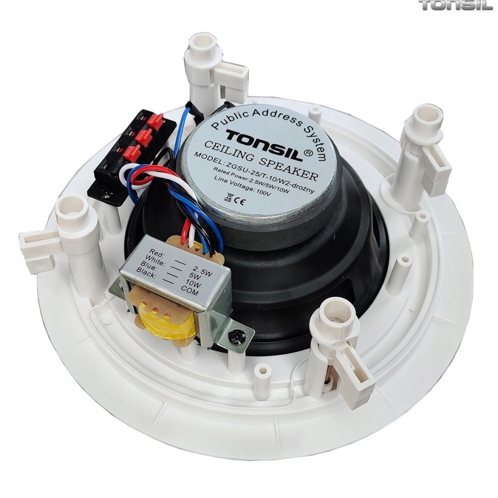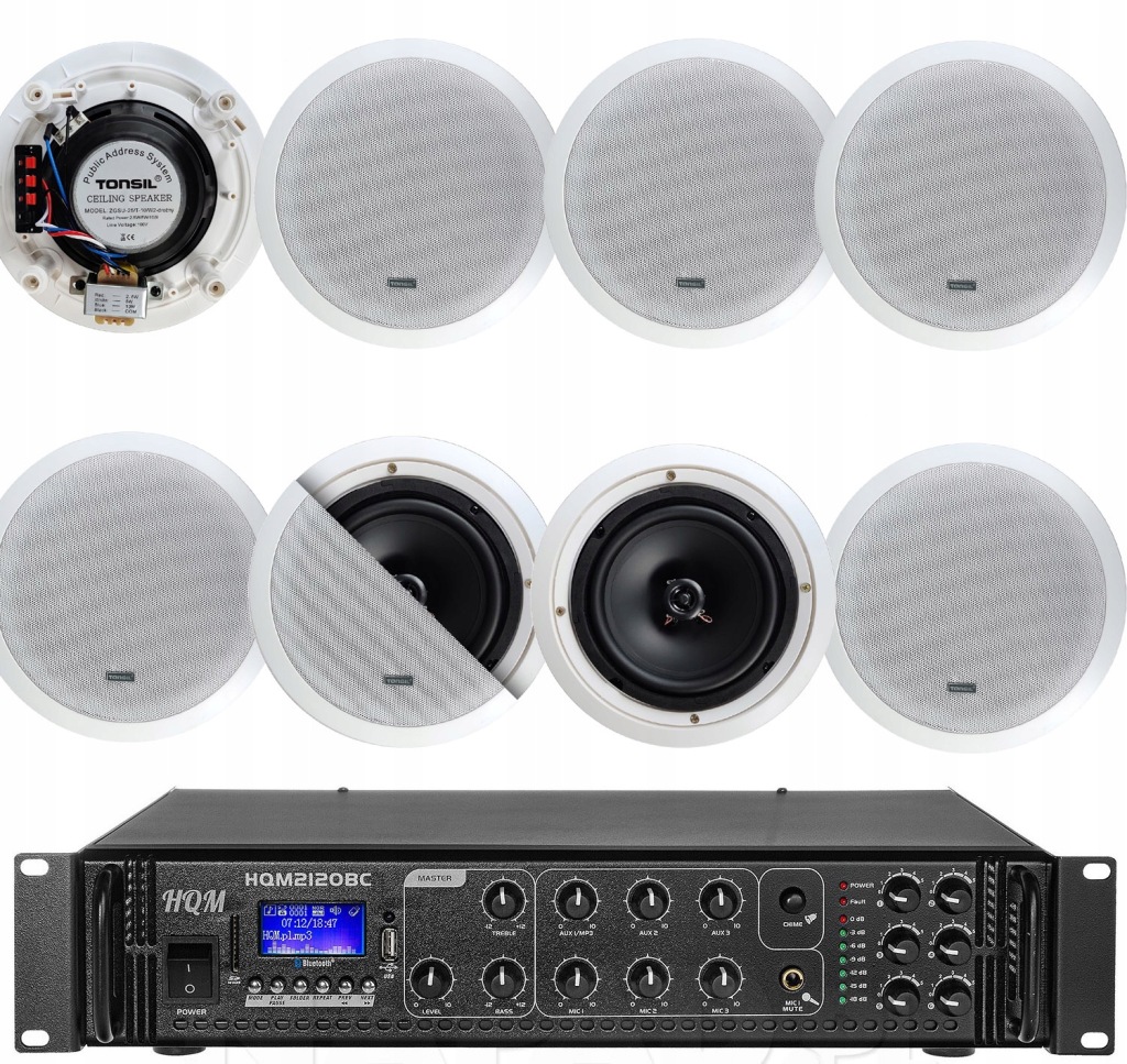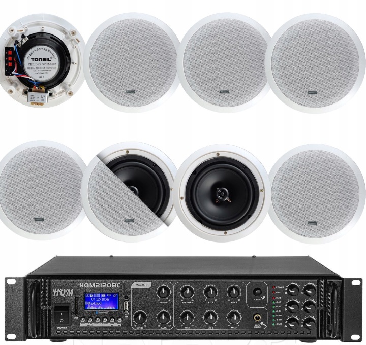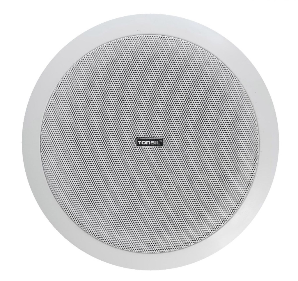 нижче ми представляємо комплект радіовузла 100V з шістьма стельовими динаміками відомого польського бренду tonsil білого кольору і підсилювач MP3.