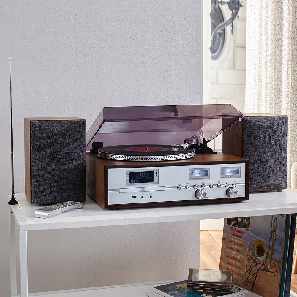 програвач відтворює вінілові платівки зі швидкістю 33 або 45 обертів на хвилину, а програвач компакт-дисків може відтворювати стандартні аудіо-компакт-диски, а також самостійно записані MP3-CD.