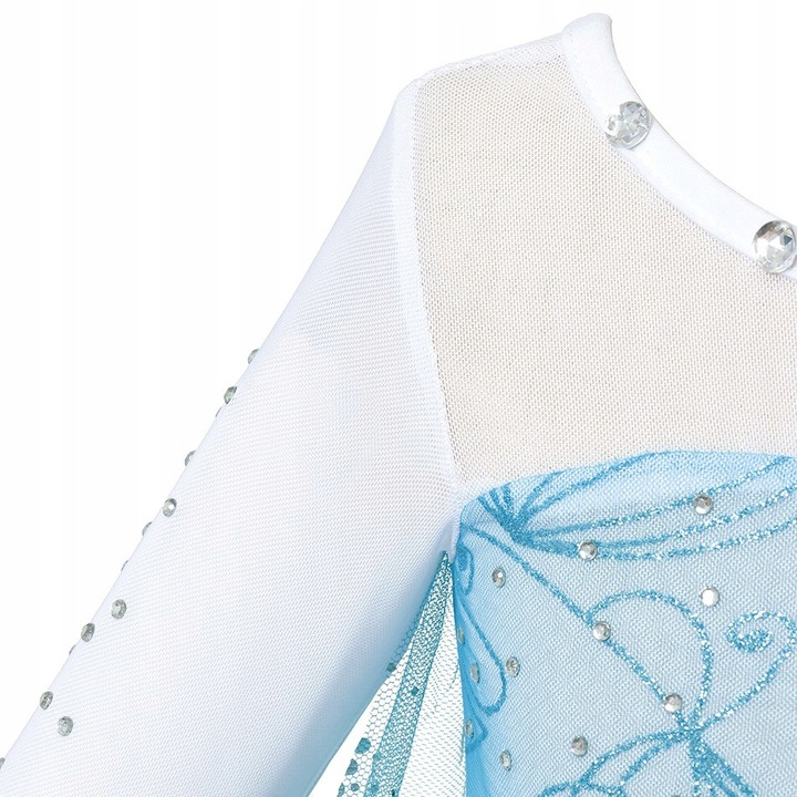 наряд точно відтворює сукню Ельзи. Сукня акуратно зшита з мерехтливих і блискучих матеріалів. На корсеті пришиті "Діаманти" у вигляді сніжинки. Рукава зшиті з тонкої білої димки. Низ сукні зшитий з 2 шарів: мерехтлива тканина і прозора срібляста тканина. Робота увінчана шлейфом, що переливається в танці блискітками.