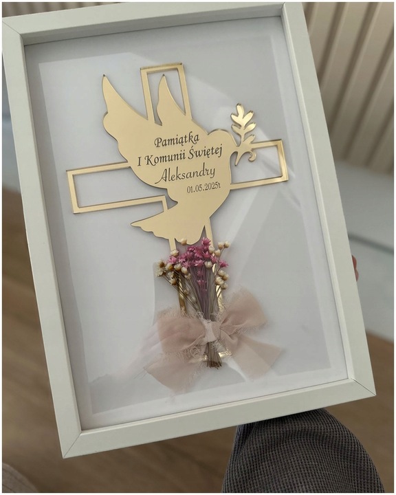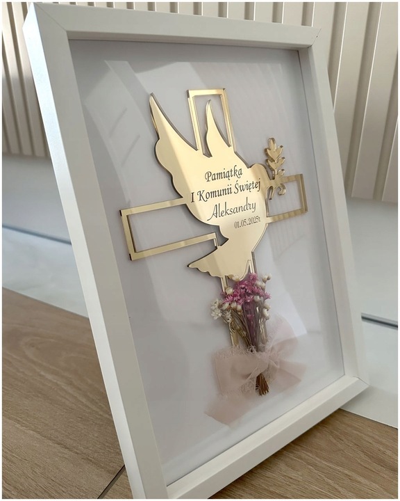елегантна біла деревʼяна рамка в центрі якої знаходиться злотий, дзеркальний символ голуба, на якому вигравірувано імʼя дитини і дата святкування.
