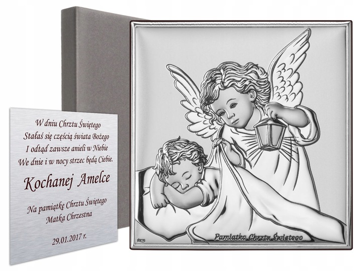 ексклюзивне Срібне зображення, бренди , італійського виробника срібних сувенірних виробів. Квадратне зображення зображує ангела-хранителя з ліхтарем. Внизу картини напис"сувенір Святого Хрещення". Така картина є унікальним подарунком або сувеніром для особливого випадку, який є Хрещенням.