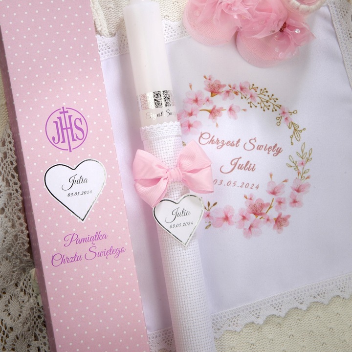 -прикрашену вручну свічку з імʼям і датою, написаної на сердечку, і написом "Святе Хрещення", яка була зроблена в методі гарячого тиснення (красиво мерехтливий Срібний принт)