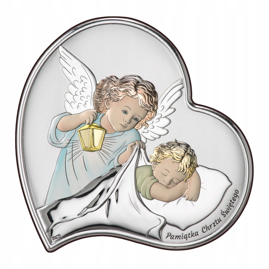 ексклюзивна Срібна картина, додатково розфарбована фрагментами, марки , італійського виробника срібних сувенірних виробів. На зображенні у формі серця зображений ангел-охоронець з ліхтарем. Внизу картини напис"сувенір Святого Хрещення". Така картина є унікальним подарунком або сувеніром для особливого випадку, який є Хрещенням.