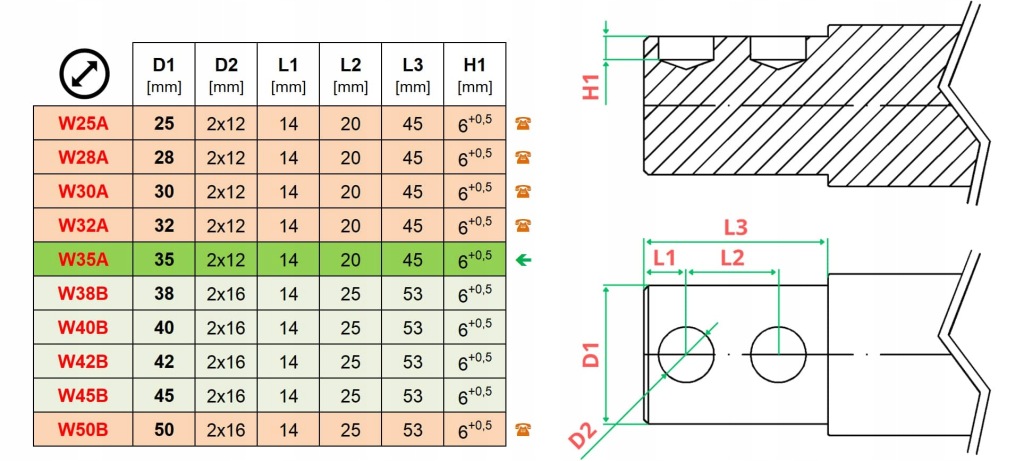 за замовчуванням у цій пропозиції ми надсилаємо розмір W35A (позначений зеленим кольором).