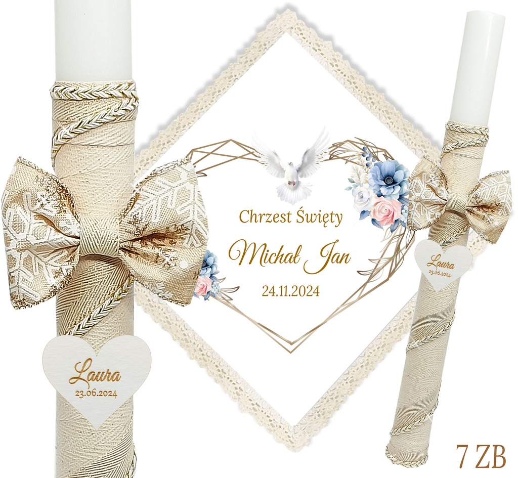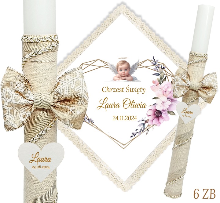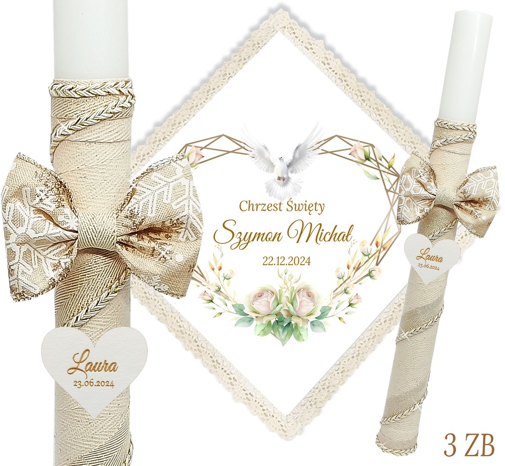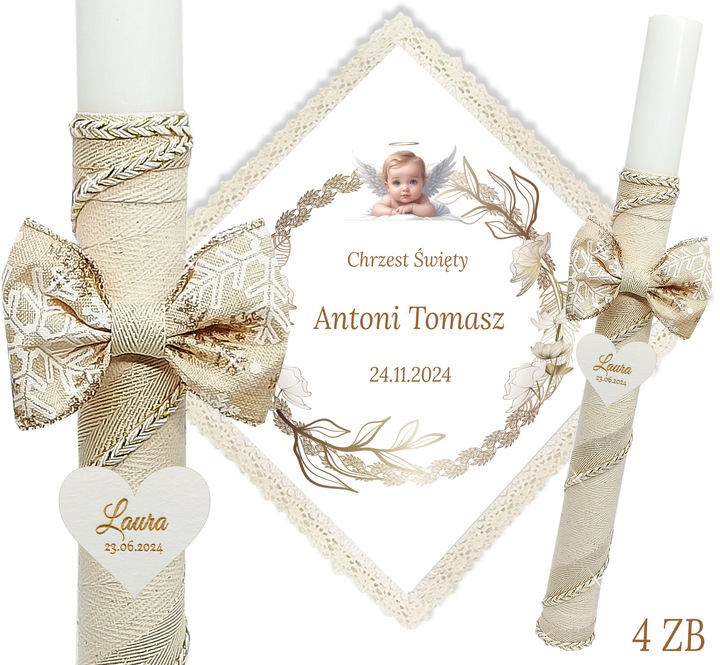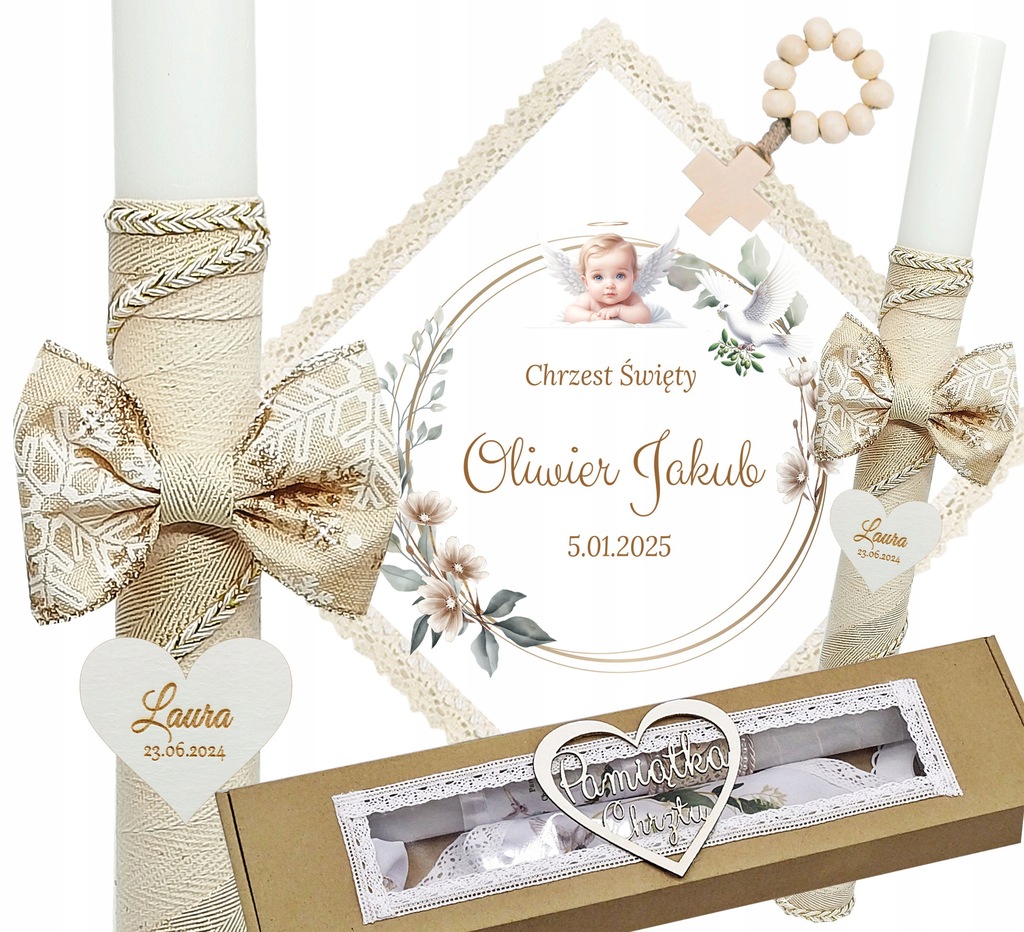 ми представляємо незвичайний набір для хрещення, що складається з одягу і свічки, це ідеальний вибір для батьків, які хочуть відзначити цей особливий день елегантно і незабутньо. Свічка була прикрашена натуральною стрічкою ніжно-бежевого кольору, а також натуральною бежевою стрічкою з ефектом позолоти і золотисто-білим шнуром. На свічці також є бежевий позолочений бант, все це створює неймовірно елегантне ціле.