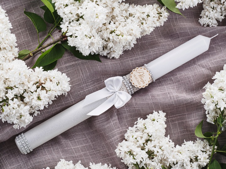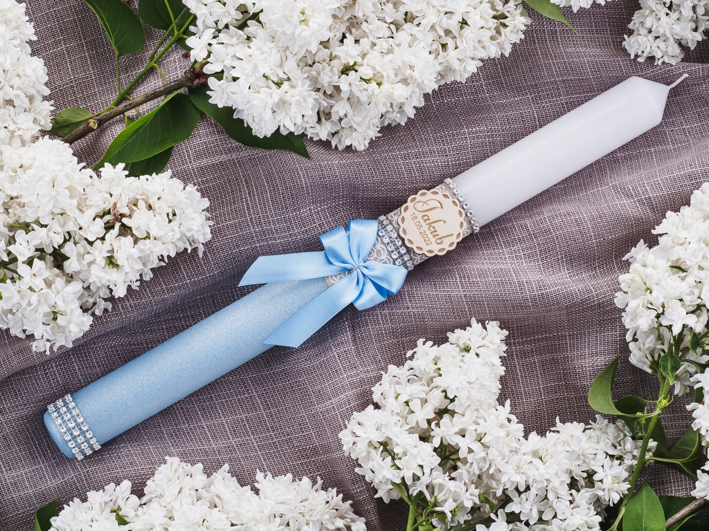 Свічка прикрашена зі смаком коричнево-білою джутовою стрічкою з мереживом, ніжним бантом і блискучими стразами сріблястого кольору.ми надаємо можливість персоналізації: можливість розміщення імені дитини і дати святкування - на свічці ми робимо гравер на деревʼяній підвісці.