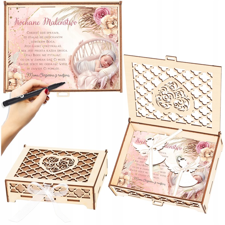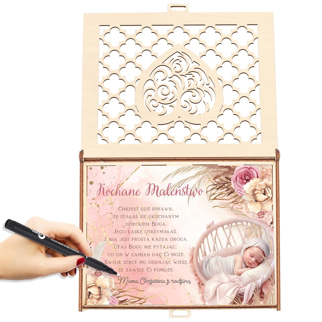 дозволяє персоналізувати подарунок за допомогоюдодавання власного підпису . Він підкреслює особистий характер подарунка, роблячи його ще більш цінним і памʼятним для недавно хрещеного дитини.