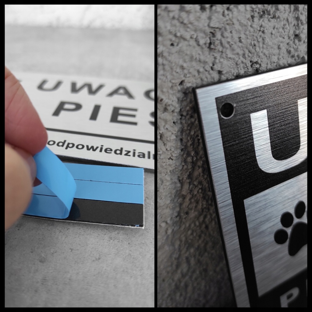 всі таблички для собак оснащені міцною монтажною стрічкою, що дозволяє легко приклеювати їх до плоскої поверхні. При необхідності ми також можемо зробити монтажні отвори. Вони допоможуть закріпити попереджувальну табличку на хвіртці або воротах. Послуга безкоштовна.