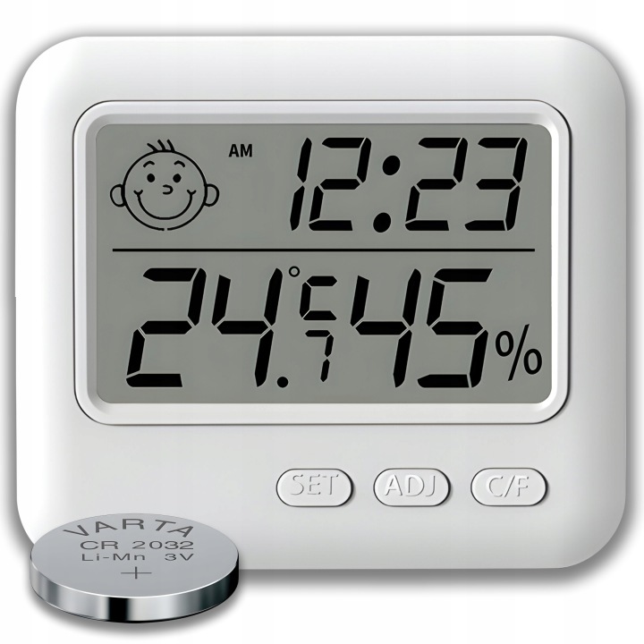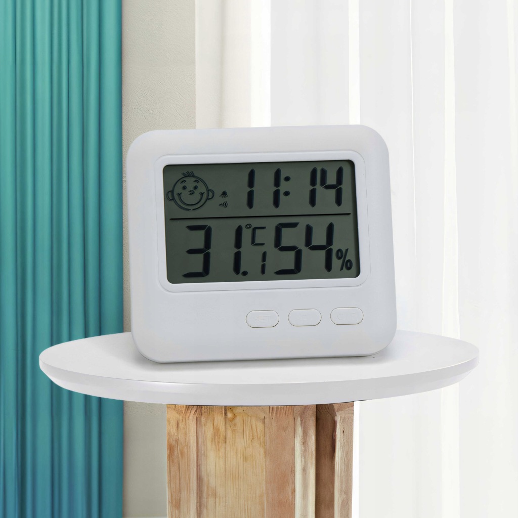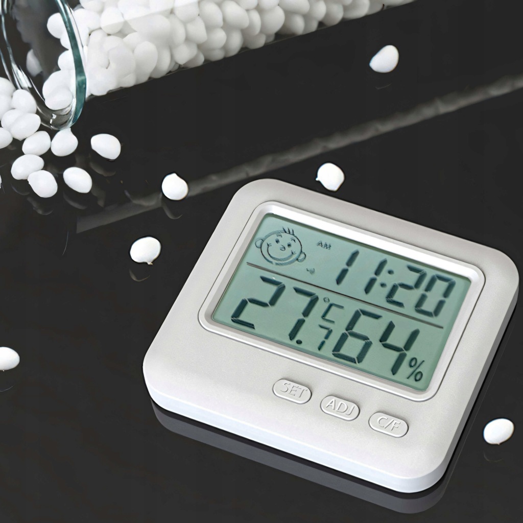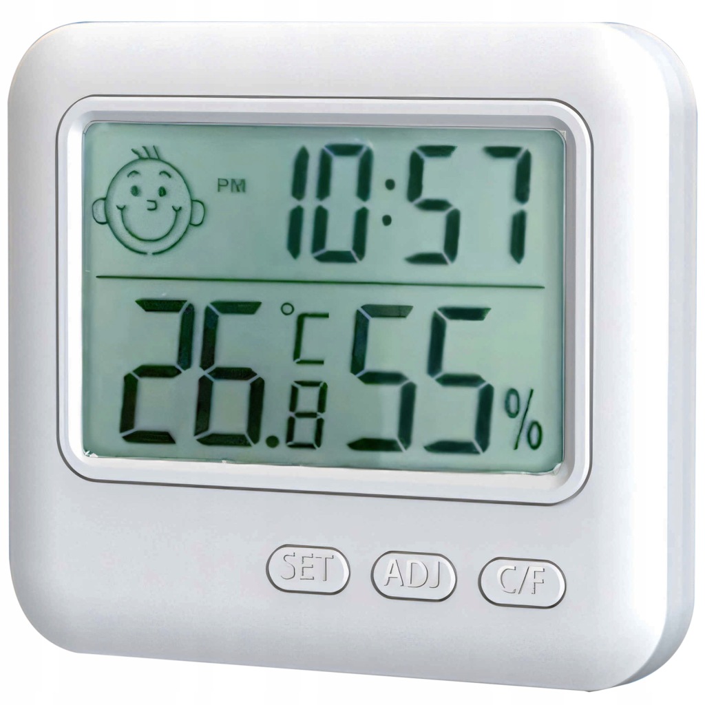 зручний прилад для щоденного контролю температури в приміщенні . Він також має додаткові функції годинник збудильником . Продукт оснащений зручним для читання РК-дисплеєм. Виготовлений із пластику білого кольору, підходить для інтерʼєрів з різною колірною гамою.