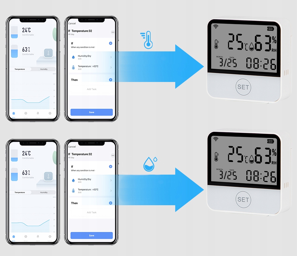 ✅ інтелектуальне зʼєднання: за допомогою цієї функції ви можете регулювати температуру і вологість в приміщенні. Коли температура в приміщенні досягає заданого користувачем ви отримаєте інформацію.
