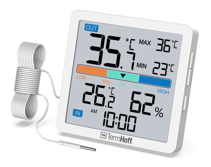 монітор температури і вологості повітря termhoff THM-04 з провідним зондом завдяки висококонтрастному екрану вся інформація чітка і чітка навіть при слабкому освітленні.