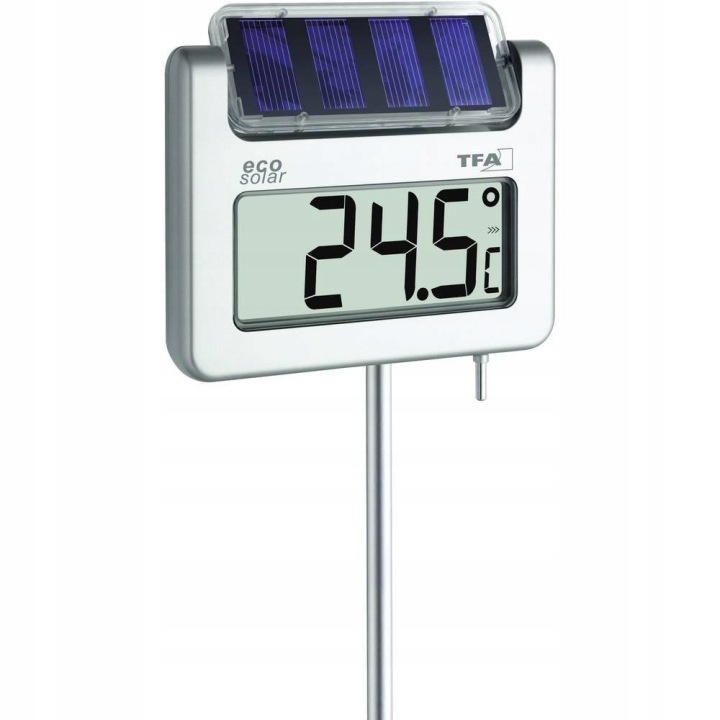 TFA 30.2026 AVENUE електронний Садовий термометр. Інструмент використовується для вимірювання температури зовнішнього повітря і призначений для використання в саду. Пристрій оснащений великим РК-дисплеєм і монтажною стійкою / стрижнем довжиною близько 115 см, тому температура вимірюється чітко над землею, а не на її поверхні. Термометр може працювати в трьох режимах: відображення поточної температури, відображення поточної температури і часу, а також відображення поточної, мінімальної, максимальної і годинної температури. Прилад має автоматичне скидання екстремальних значень. Для підсвічування дисплея термометр має сонячну панель з акумулятором.