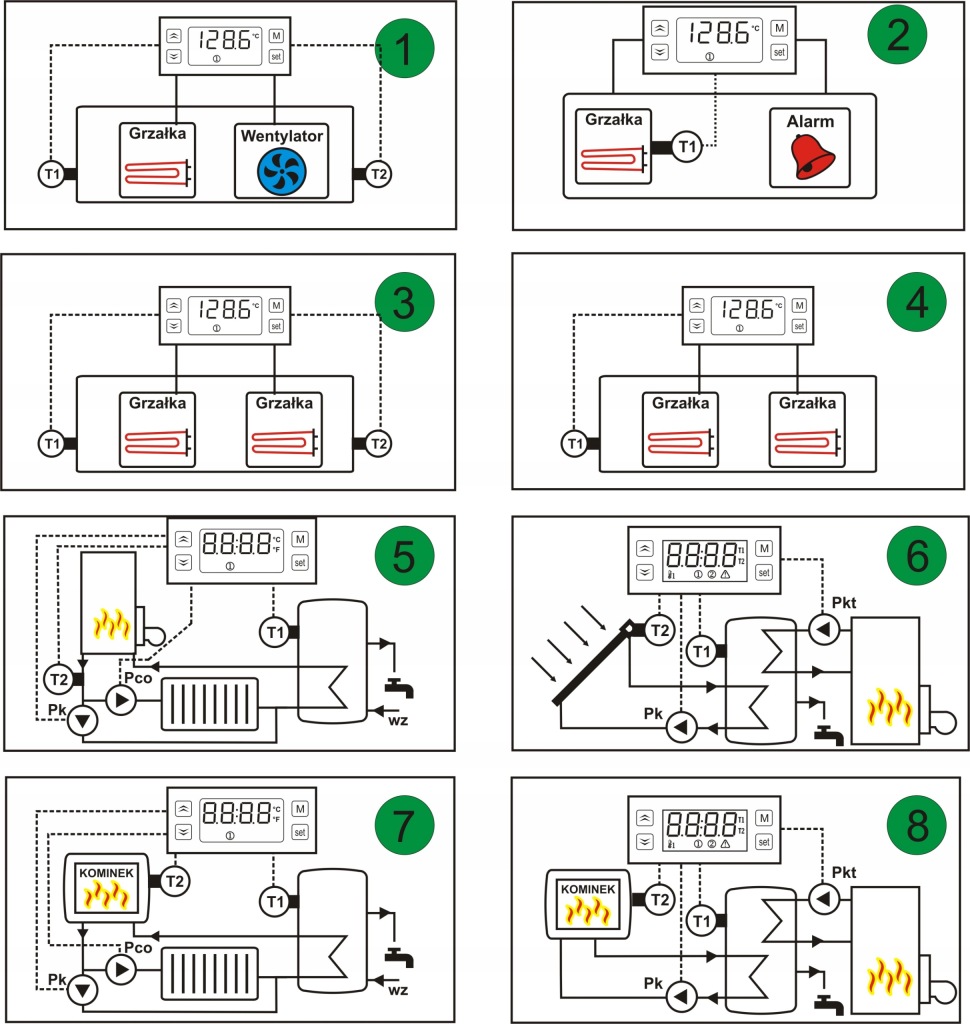 за допомогою математичних функцій вимірювання з двох датчиків може бути розраховане як різниця [T2-t1] (використовується в системах з сонячним колектором) або середнє значення [T1+T2] / 2.
