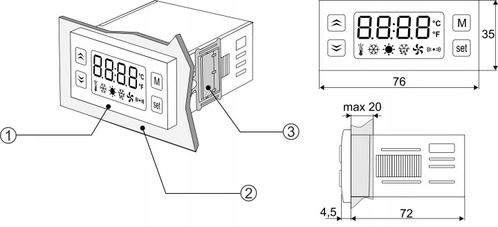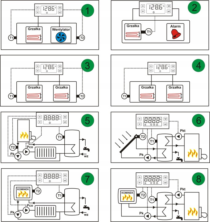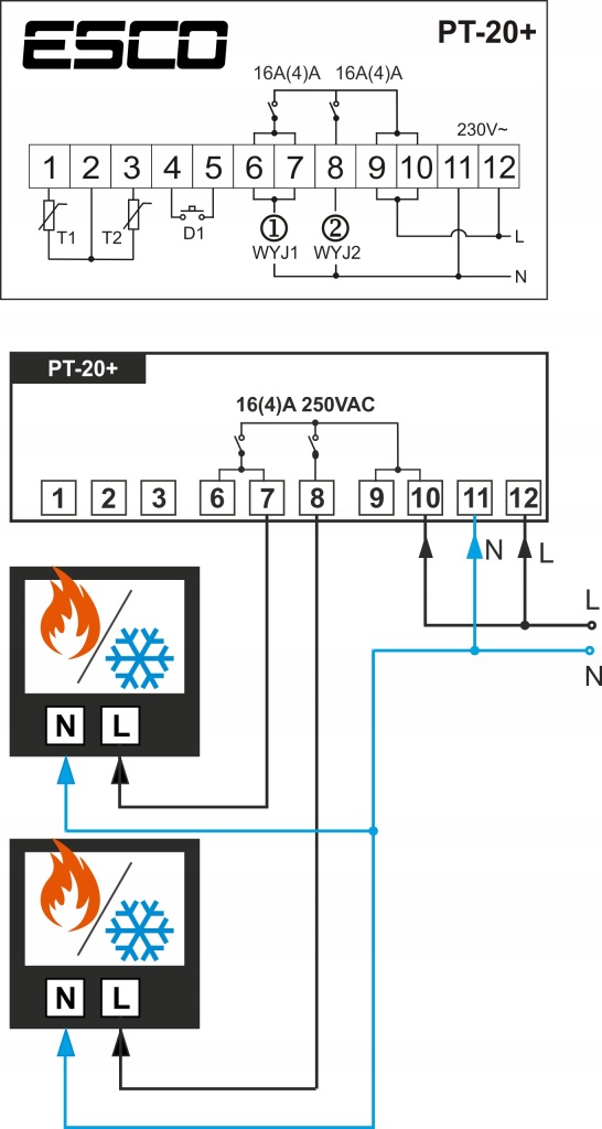 PT-20+-це два регулятора температури, розміщені в одному корпусі з можливістю довільної конфігурації входів-виходів і звʼязку обох регуляторів. Пристрій має 2 входи і 2 керуючих виходу, які можуть працювати в режимі Обігрів або охолодження, а вимірювання вимірюється з датчика T1 або T2 або з обох датчиків одночасно.