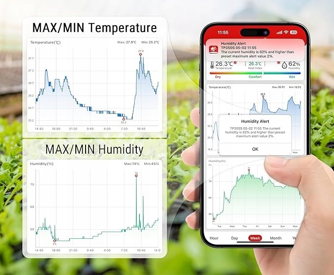✅ 2 роки зберігання та експорту даних - легко зберігати, аналізувати та експортувати дані, щоб краще планувати оптимальні умови навколишнього середовища.