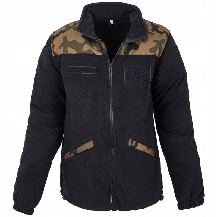 флісова толстовка чорного кольору з камуфляжною вишивкою. Він має дві глибокі кишені на блискавці, які дозволяють упакувати необхідне спорядження. На грудях і рукавах є липучки, які використовуються для прикріплення додаткових нашивок і прапорів. У верхній частині є високий комір, що захищає шию від несприятливих погодних умов. Теплий і дуже зручний, він відмінно працює як толстовка для самостійного носіння або як підкладка під куртку. Не пиляє і не витирає-зроблено польським виробником