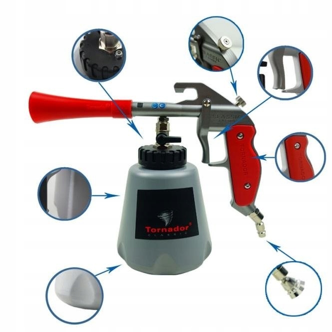 пістолет Tornador Classic працює на стислому повітрі. Спеціальний шланг всередині труби обертається з великою потужністю, що призводить до дуже сильного обертання повітря. Утворюється, простіше кажучи, так званий вихор (Назва від торнадо), який з великою силою вибиває бруд з обʼєкта, який ми очищаємо. Дозуючи для цього очищувальну рідину, яку пристрій дуже тонко розпорошує і під великим тиском виводить, дозволяє швидко і ефективно видалити бруд з обʼєкта, який ми чистимо.