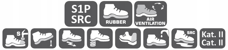 - Матеріал: верх: рип-стоп трикотаж, зовнішня конструкція збільшує циркуляцію повітря всередині взуття, передня, бічна і задня частини посилені міцним пластиком КПУ. Підкладка: сітчастий трикотаж. Підкладка: знімна, товщина 1,5 см в пʼяті, мʼяка і еластична. Підошва: гумова з протиковзкими властивостями (сталева і керамічна підкладка), Стійка до дизельного палива, глибокий протектор забезпечує високу стабільність взуття