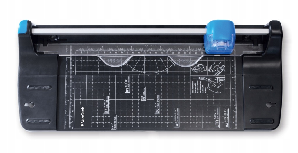 тример марки Verotech-це простий пристрій, призначений для різання документів і фотографій формату A4. Він має стільницю з маркуванням форматів і шкалу в сантиметрах. Дозволяє розрізати до 5 аркушів паперу один раз.