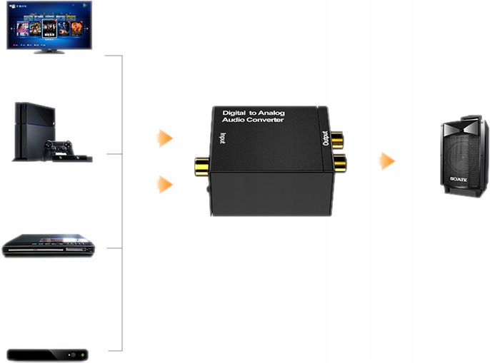 цифровий аудіо конвертер (ЦАП) Toslink / оптичний SPDIF в аналогові розʼєми RCA. Він забезпечує перетворення 2-канальних цифрових коаксіальних або Toslink / оптичних сигналів SPDIF в аналогові стереовиходи RCA.