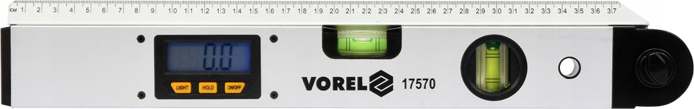 електронний транспортир призначений для точного визначення кутів в діапазоні вимірювань від 0° до 230& # 176; при масштабуванні з кроком 0,1°. Корпус виконаний з алюмінієвого профілю, виконує функцію забезпеченого двома лібеллами рівня. З її допомогою ми можемо точно позначити лінії 180 або 90°. Рухома рука довжиною 400 мм має на своєму краю постійно нанесений міліметровий крок. Результати вимірювань зчитуються на великому РК-екрані з підсвічуванням. Функція утримання-для тимчасового блокування результату вимірювання і функція автоматичного відключення, що захищає батареї 9 в, підвищує корисну цінність транспортира.