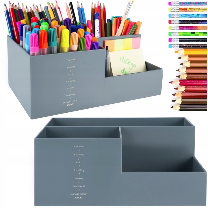 два глибших відсіку ідеально підходять для ручок, олівців, маркерів або ножиць, в той час як менший відсік ідеально підходить для невеликих приладдя, таких як скріпки, гумки, кнопки або замітки.