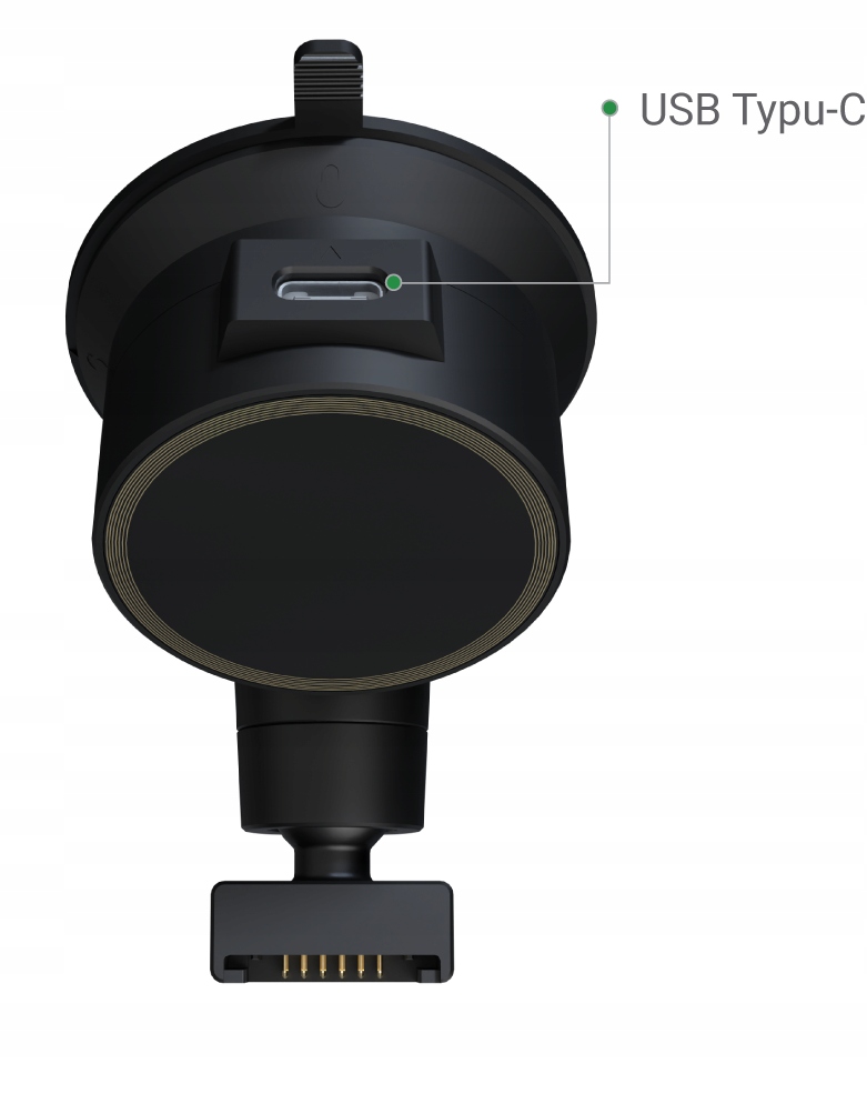 присоска з поворотним механізмом блокування забезпечує надійну установку відеореєстратора на лобове скло автомобіля. Крім того, для зручності монтажу і підключення до джерела живлення пристрій має наскрізне живлення через розʼєм USB Type-C, розташований на тримачі. Другий розʼєм USB Type - C розташований на корпусі пристрою і призначений для підключення відеореєстратора до компʼютера.