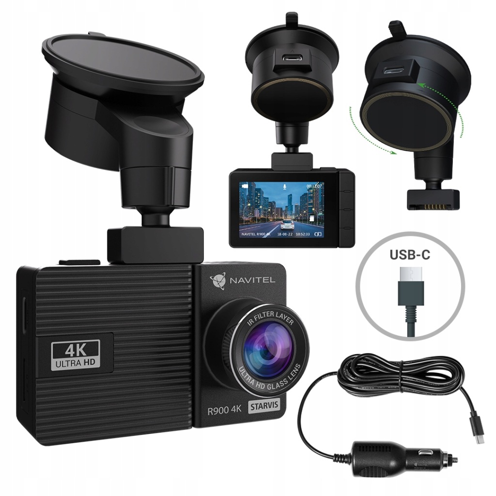 - в комплекті: відеореєстратор NAVITEL R900 4k, автомобільний тримач, автомобільний зарядний пристрій 12/24 В , кабель USB-C, серветка з мікрофібри, кард-рідер, керівництво користувача, гарантійний талон
