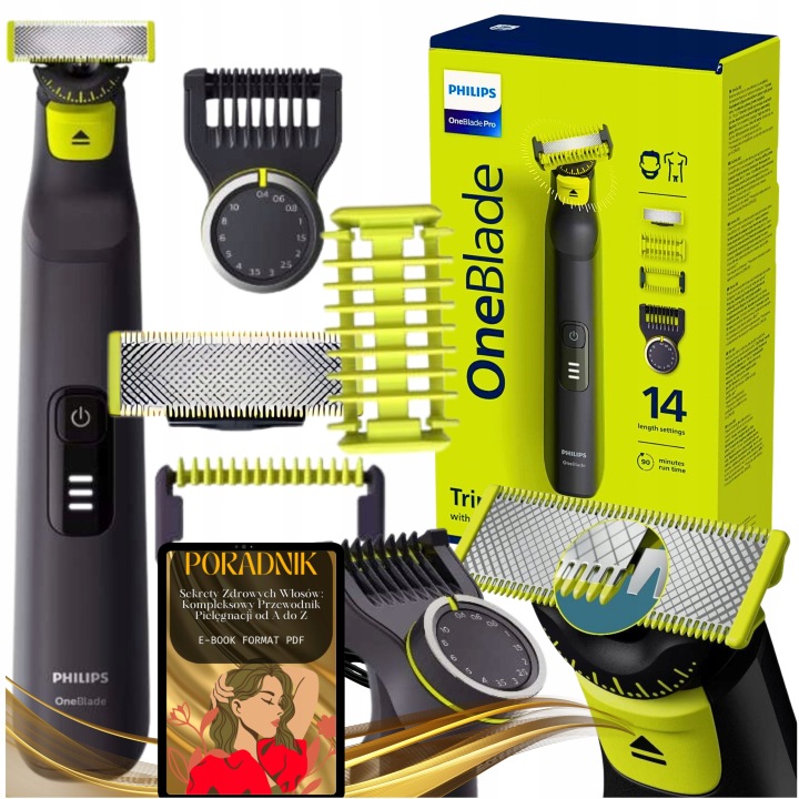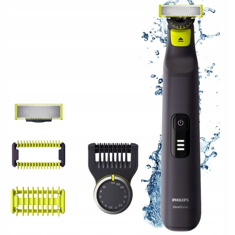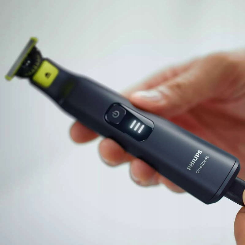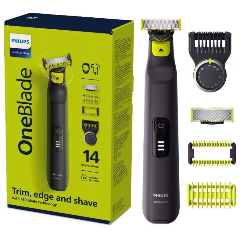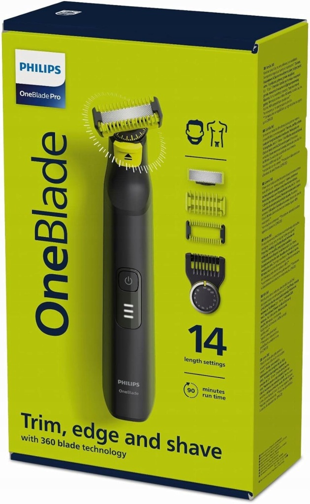 бритва Philips OneBlade Pro включає в себе додаткове лезо, насадки для тіла і чутливих місць, а також прецизійну накладку, регульовану в 14 Налаштуваннях довжини. Комплект готовий для щоденного використання і подорожей.