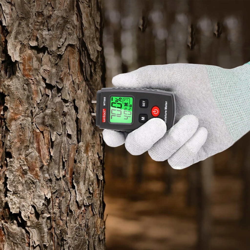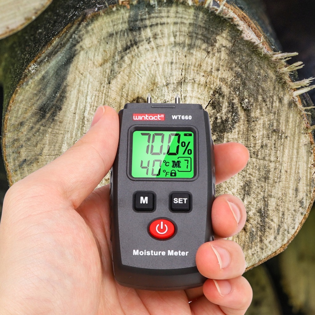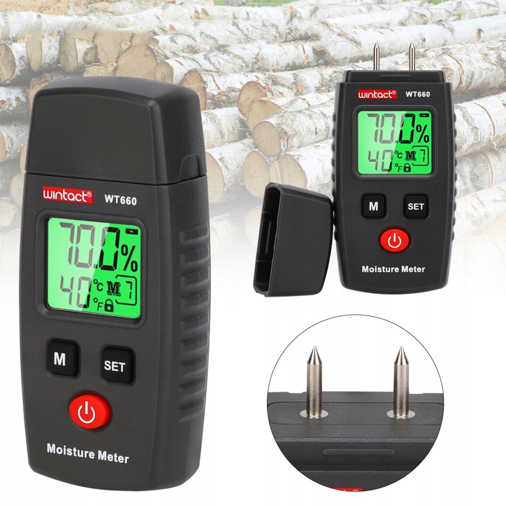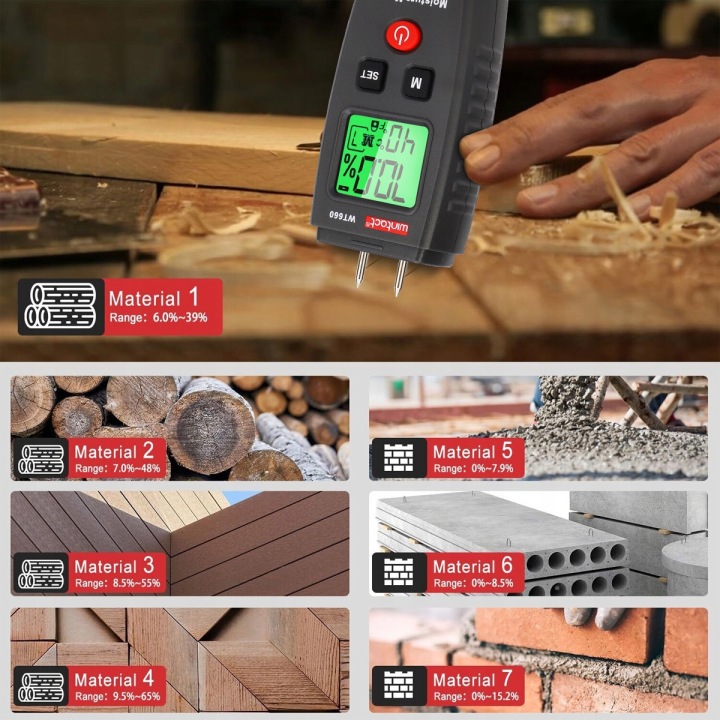 ✔️ вимірювач вологості для вимірювання вмісту вологи в деревині і деревних матеріалах і будівельних матеріалах. Залежно від типу дерева або матеріалу доступно в цілому 7 режимів вимірювання.