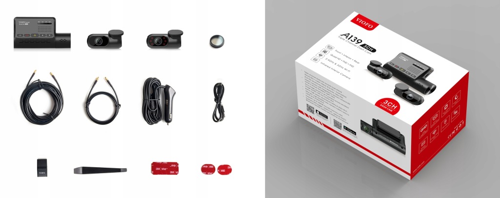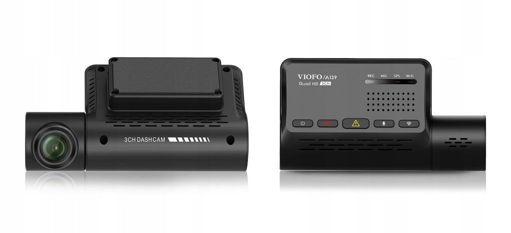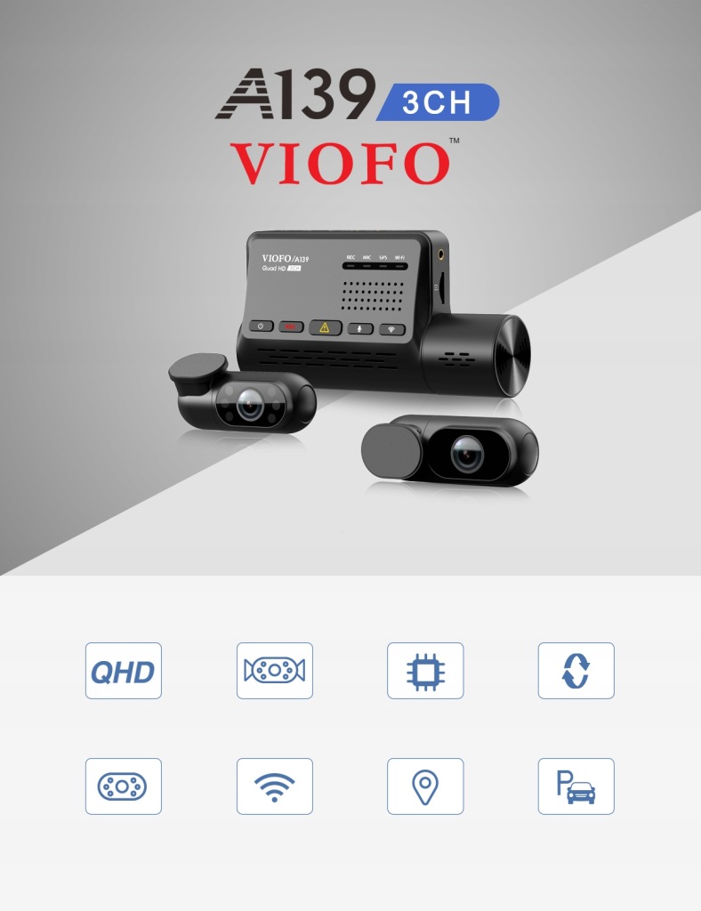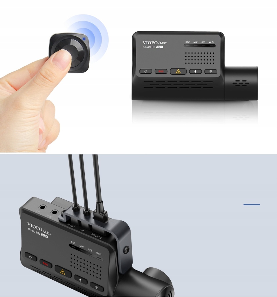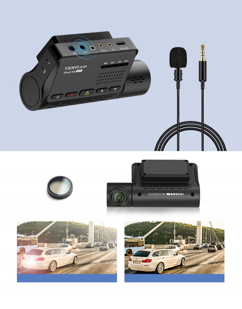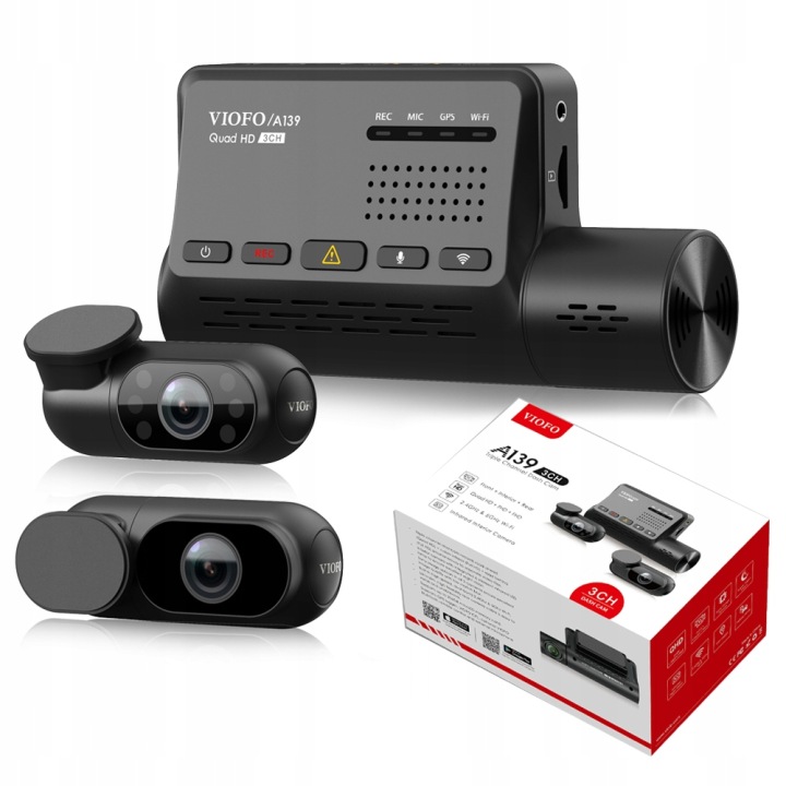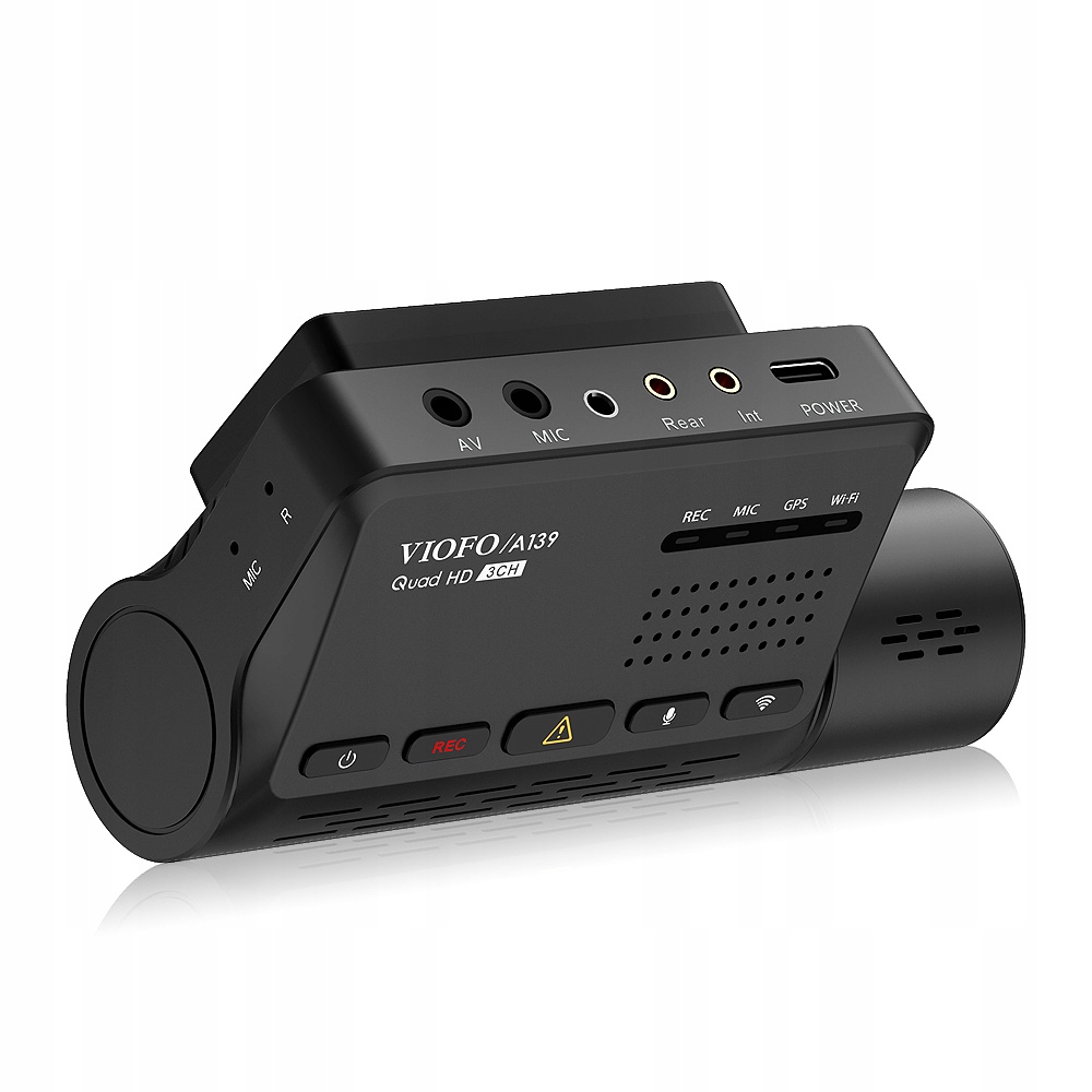автомобільна камера VIOFO A139 3CH - це новітня модель камери, яка поставляється з 3 камерами в комплекті. І інтерʼєр, і передня частина були оснащені потужним сенсором Sony STARVIS IMX291. фронтальна камера отримала сенсори SONY STARVIS IMX335, відомі за моделями A119 V3 і A129 PLUS. VIOFO вдосконалив свою новітню модель, оснастивши її всіма можливими зручностями. У камері був встановлений модуль WIFI , що працює на двох діапазонах 2.4 Ghz і 5GHz-всією камерою можна управляти з позиції телефону (безкоштовний додаток VIOFO для iOS і Android), ми можемо переглядати зроблені записи і копіювати їх на телефон. Камера має вбудований модуль BLUETOOTH - ви можете придбати кнопку bluetooth для забезпечення безпеки запису. Є можливість підключити зовнішній мікрофон, якщо ми хочемо кращої якості звуку. Живлення камери засноване на суперконденсаторах, що гарантує стабільну роботу навіть при екстремальних перепадах температур. Камера інформує користувача за допомогою голосових підказок про стан запису, проблеми з картою памʼяті, включеному мікрофоні.