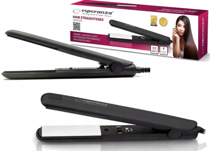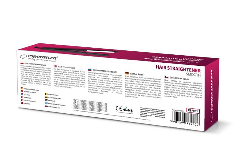 випрямляч Esperanza SMOOTH EBP001-це зручний пристрій, призначений для легкої укладання волосся, потужністю 35 Вт. пластини з керамічним покриттям швидко нагріваються до максимальної температури 200°C, тому вже через деякий час користувач може приступити до укладання зачіски. Крім здатності швидко нагріватися, пластинчасте покриття захищає волосся від пошкоджень і надає їм сприятливий блиск і приємну гладкість. Рухомі пластини адаптуються практично до будь-якої товщини волосся, що значно спрощує процес випрямлення. До конструктивних переваг відносяться легкість обладнання і кабель з поворотним розʼємом на 360°, завдяки якому провід не скручується під час використання.