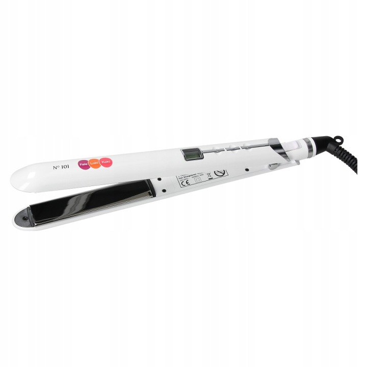 обертовий (360°) шнур довжиною 2,7 м повний нагрів за 30 секунд розміри пластин: 24 x 110 мм холодний наконечник температурний дисплей (РК – дисплей) кнопки регулювання температури +/- кнопка включення/вимикання випрямляч Напруга: 220-240VAC 50/60 Гц Потужність: 40 Вт