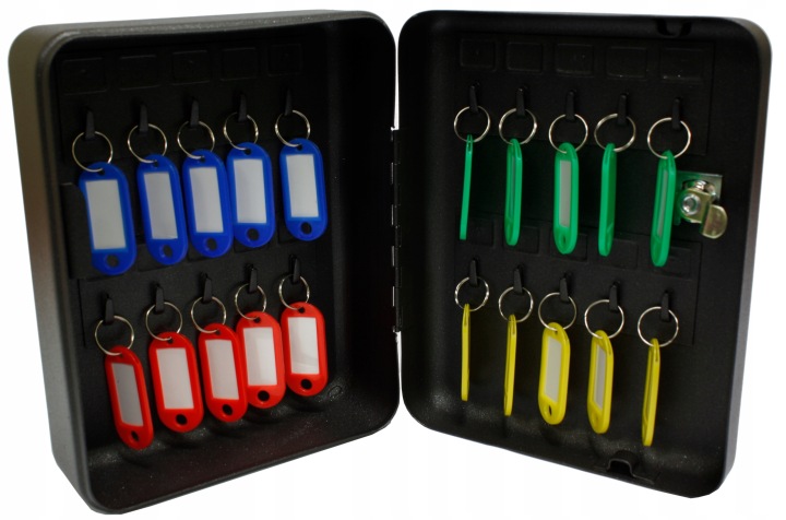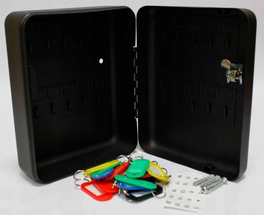 коробочка з замком від Verotech має 20 гачків для підвішування ключів, які прикріплені до внутрішньої, задньої стінки і двері. Вона забезпечена етикетками з номерами, що дозволяє підтримувати порядок. Виріб виготовлено з екструзійної сталі і покрито епоксидним лаком.