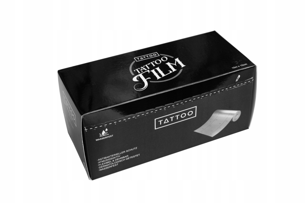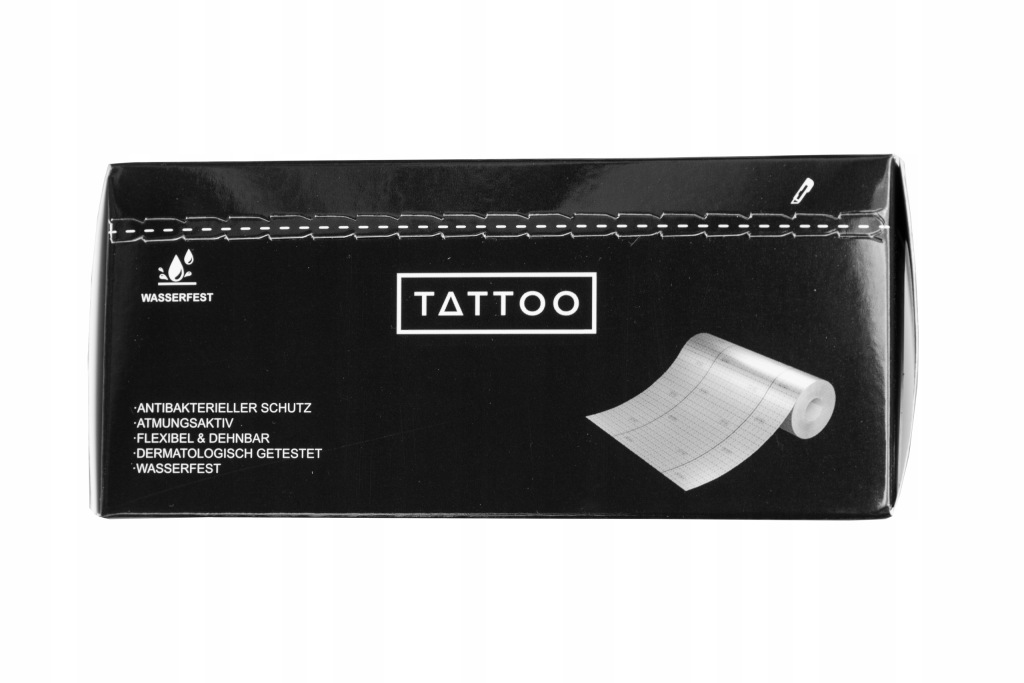 рулон повʼязки для типу татуюваннядруга шкіра він виготовлений з мʼякої, зручної,тонкої плівкинапівпроникної водонепроникної поліуретанової плівки, ПЕТ-підкладки, жолудевого і випускного паперу. Прозорий, водонепроникний, зручний і дихаючий, антиалергенний, дозволяє приймати душ або плавати, не промокаючи шкіру.