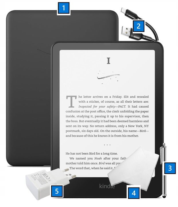 - в комплекті: Kindle Paperwhite, зарядний кабель USB-C і короткий посібник користувача.