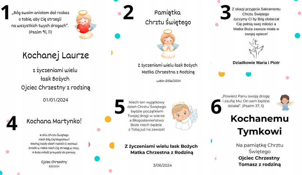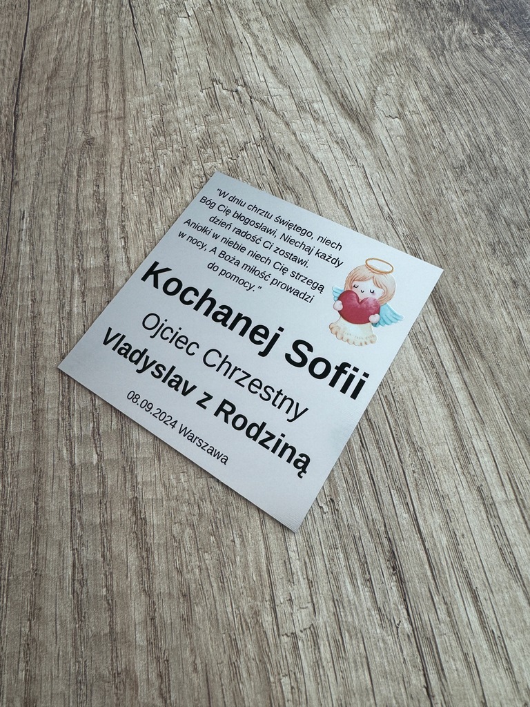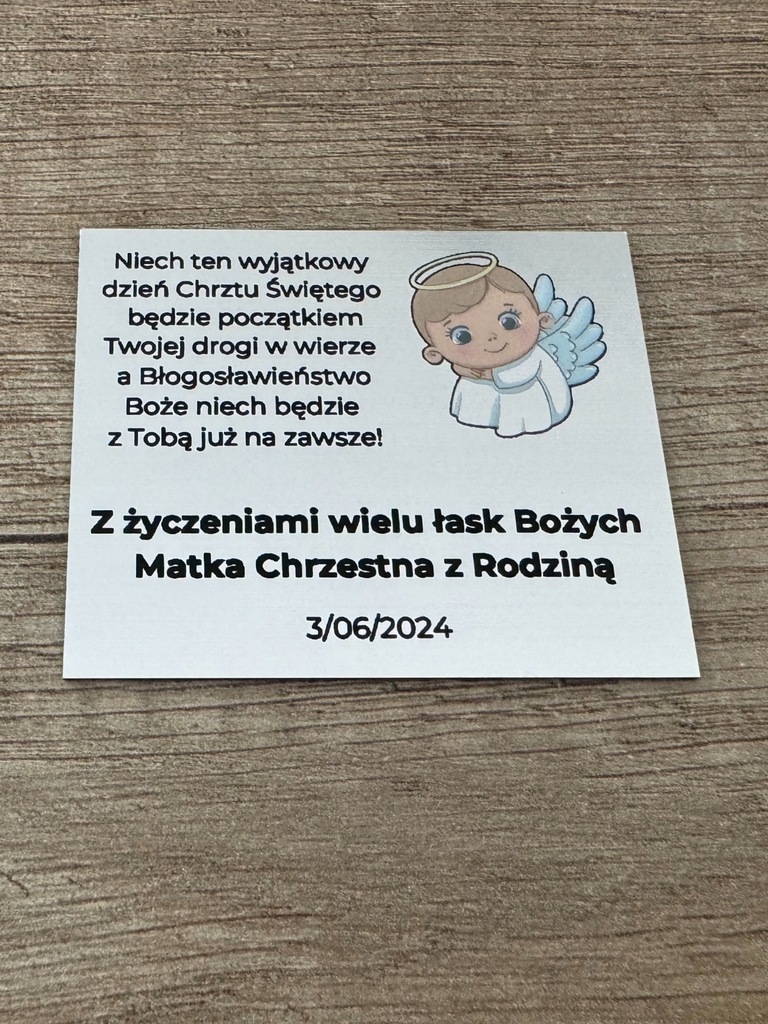 будь ласка, виберіть дизайн від 1 до 6 і ІМʼЯ дитини, наприклад, Martynce, , від кого подарунок, наприклад, Хрещений батько, ДАТА і/або місце, наприклад, Люблін, 07.05.2024 року.