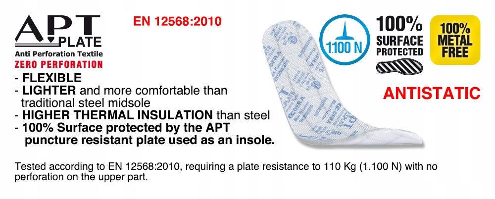 вставка: EVANIT, виготовлена зі спеціальної суміші Eva і нітрилу, з високою вантажопідйомністю і змінною товщиною (12 мм - 8 мм - 3,8 мм). Термоформований, анатомічний, перфорований і покритий дуже дихаючою тканиною. Антистатичний завдяки спеціальній обробці на поверхні і швах з провідної пряжі